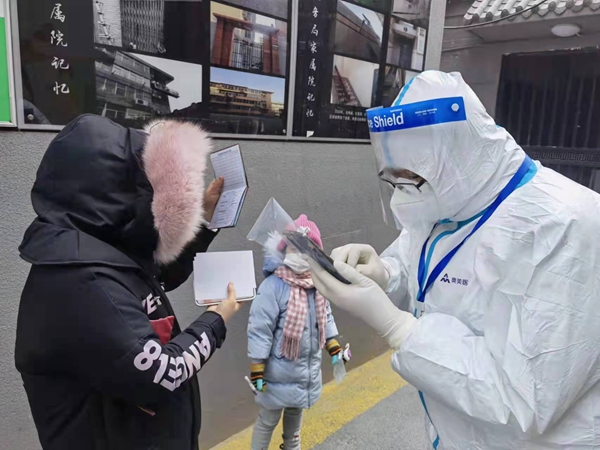 孩子年齡較小需手動輸入、老人操作手機不方便,影響整體進度,加之天氣寒冷,業(yè)主們都比較焦急,她輕聲細語、條理清晰地引導溝通。全天社區(qū)共采樣3160份,她本人服務1500余人,下班時防護衣已經(jīng)快粘在身上了,當時只是感覺到很冷很口渴,十指已經(jīng)僵硬。