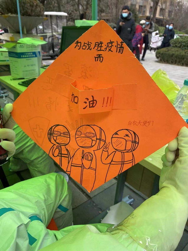 “這是小朋友送來的手工賀卡。因為每次做核酸的過程中,手上要不停噴酒精,做一個噴一,居民灌了好幾大桶熱水給我們暖手……”在郭杜街道書香路社區(qū),配合完成5500位常駐居民核酸采樣的新型能源公司鄭智超,感動地說:“能夠與這么一群優(yōu)秀的醫(yī)務工作者一起戰(zhàn)斗倍感榮幸,我會做好防疫工作,為我們共同熱愛的城市貢獻一份陜煤力量。”