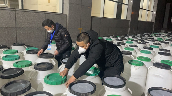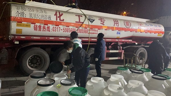 12月31日凌晨0點05分陜煤集團工作人員伴著夜幕卸載消毒液。