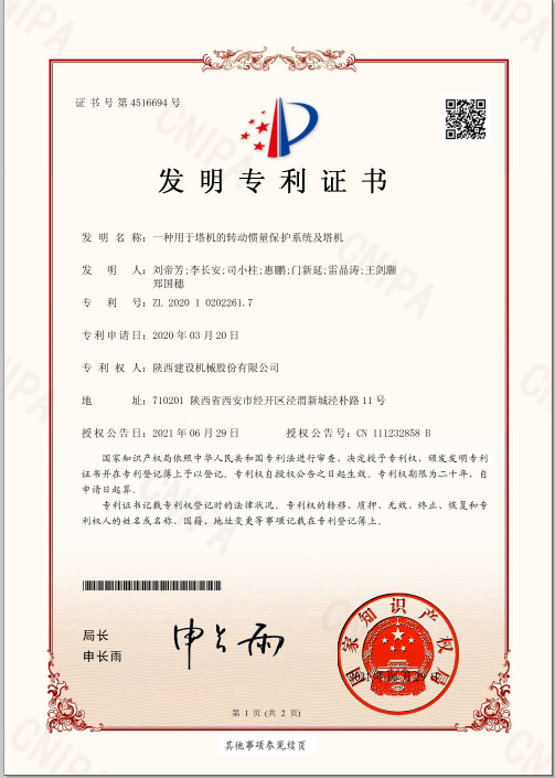近日,陜建機股份公司《一種用于塔機的轉(zhuǎn)動慣量保護系統(tǒng)及塔機》獲國家知識產(chǎn)權(quán)局頒發(fā)的發(fā)明專利證書。