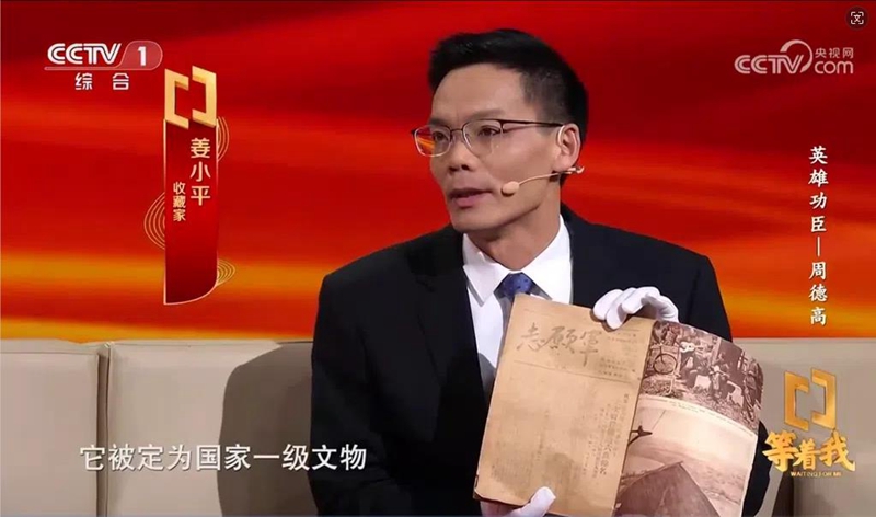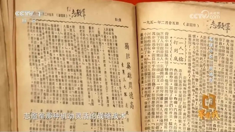 節(jié)目中,姜小平展示了他珍藏的1951年在朝鮮戰(zhàn)地出版的《志愿軍》報合訂本,該合訂本從創(chuàng)刊號到第四十期,被認定為國家一級文物。在1951年2月25日出版的《志愿軍》第八期中,《獨膽英雄周德高》一文介紹了周德高的英雄事跡。