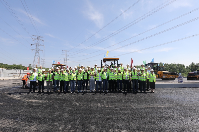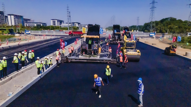 當天下午,與會來賓共同來到合肥市習(xí)友路(新橋大道—將軍嶺路)智能交通一期工程項目現(xiàn)場進行了現(xiàn)場觀摩,該項目為雙向六車道路面工程,當前正進行底層瀝青混合料施工。項目選用三臺陜建機股份SUM7200D型瀝青混凝土攤鋪機并鋪作業(yè),攤鋪寬度17.5m,攤鋪厚度8cm,混合料最大粒經(jīng)2.6cm。公司攤鋪機先進的操控技術(shù)、滿意的攤鋪效果、高效的施工進度,贏得全體來賓的一致好評。本次觀摩為公司路面機械設(shè)備市場開發(fā)奠定了堅實基礎(chǔ)。